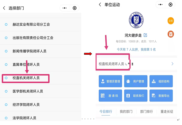 原注册用户:已于之前参加过我校健步走活动的,直接搜索“运动步数榜”小程序或公众号,点击“我的单位”,将本人部门选择修改为“**单位闭环人员”,点击“确定”即可,刷新小程序后本人部门信息完成变更,继续参加本次活动(操作步骤详见下图)。