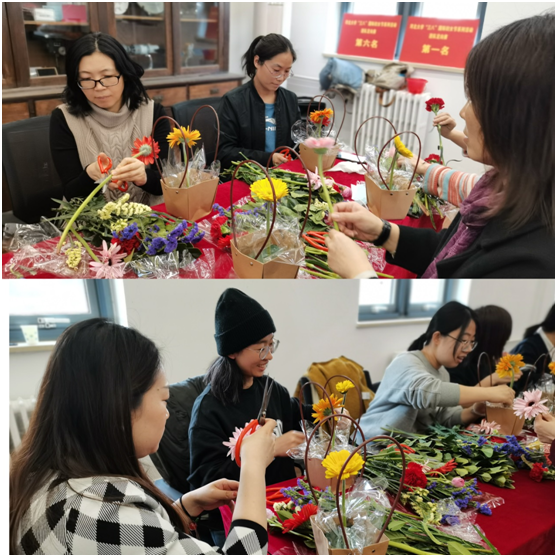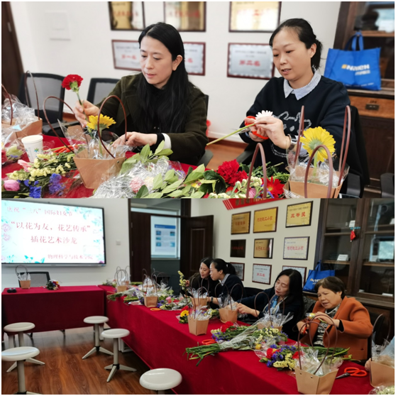 一花一世界,花草间感受生活之美。在这个春意盎然的日子里,我院女教师们迎来了第113个国际妇女节,我国第100个妇女节。为表达我院对女教师们美好的节日祝福,物理科学与技术学院分工会于3月16日下午在物理楼工会小家举办了“以花为友,花艺传承”的插花艺术沙龙活动。花香弥漫的鲜花一一摆放在桌面上,绽放的花朵书写着春天的气息,锦簇的花团凝聚着诚挚的祝福。