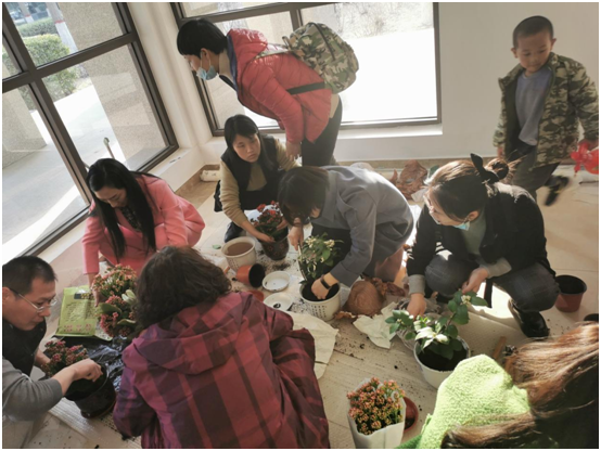 在芬芳的花香和愉快的气氛中,大家挑选鲜花,移栽新盆,巧手修枝剪叶,填土,逐步完成了自己的作品,现场气氛热烈又浪漫,人人脸上洋溢着幸福的笑容。每一盆鲜花,都蕴藏着对未来美好生活的热爱和向往,都谱写着唱给生活的赞歌。