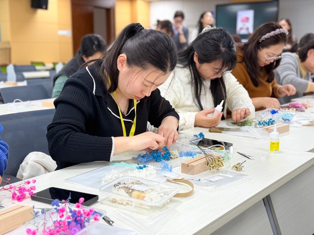 随后,永生花夜灯制作活动正式开始。女教职工们围坐在一起兴致盎然地挑选干花、搭配色彩、粘贴造型,将一朵朵干花与透明灯座巧妙结合。大家相互交流、彼此协助,经过精心创作,一盏盏造型别致、色彩缤纷的永生花夜灯应运而生,看着自己的作品,每个人脸上都露出满意的笑容。
